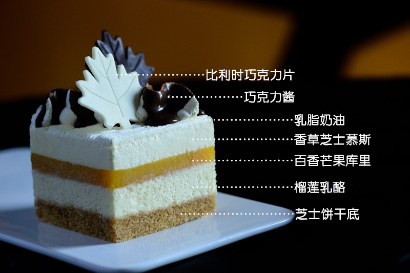 原材料:榴莲(马来西亚) 芝士(新西兰) 果茸(法国) 等